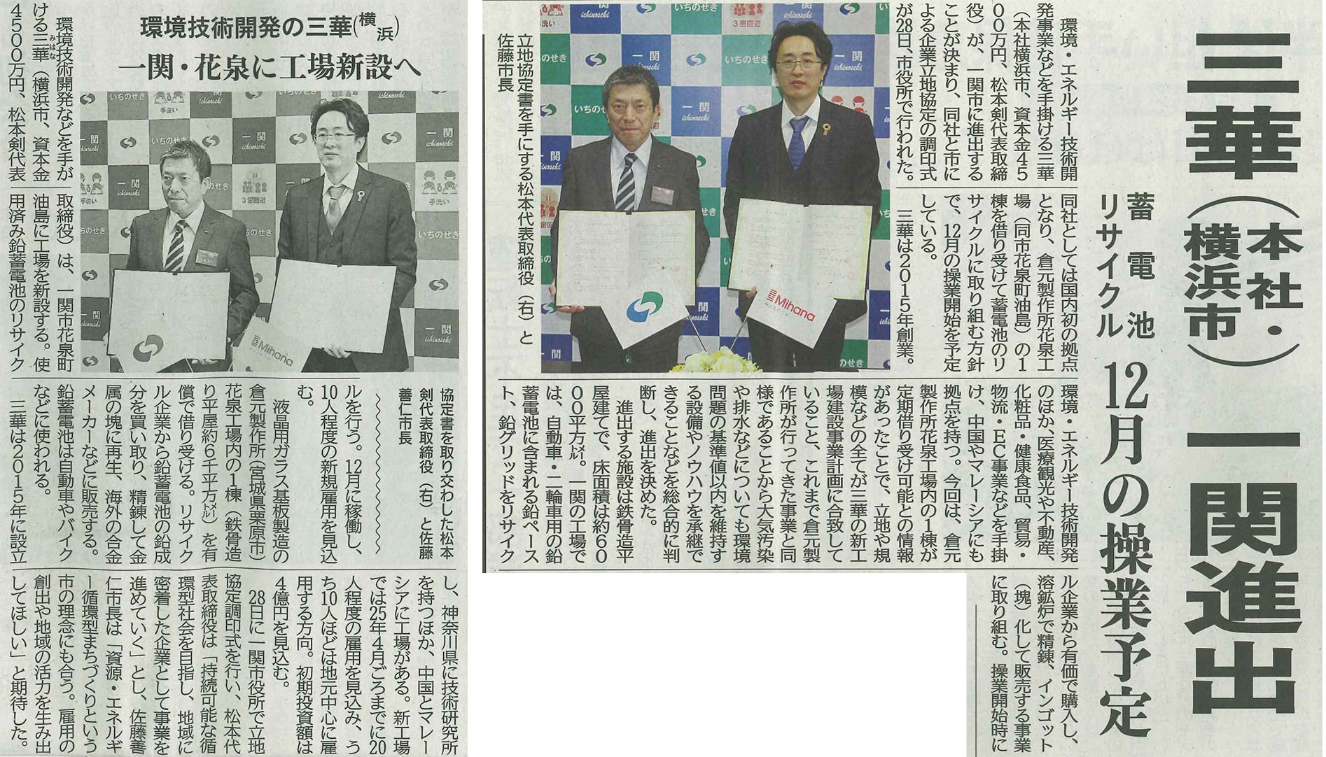 株式会社三華は鉛蓄電池リサイクル事業の国内初の拠点として岩手県一関市への進出を決定し、